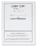 Use this white tax return cover for a classic presentation to your client. It features a summary of information plus safe storage instructions on the front. Add a touch of class with a custom imprint of your name and address. Compatible mailing envelopes can provide added security for mailing. This cover is available on smooth 80lb cover stock and measures 8 3/4" x 11 1/2" when folded.