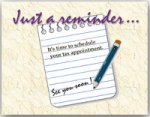 Use these Just a Reminder postcards to prompt your clients to schedule a tax appointment. These unique 8 1/2" x 11" perferated sheets allow you to add names and addresses to four cards at a time with your own laser printer, then separate them easily. This style is available in quantities of 100 cards. Back Message: Please call soon to set up an appointment. We look forward to serving your tax needs again this year.