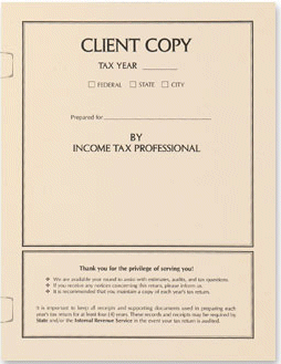 Use this almond tax return cover for a classic presentation to your client. It features a summary of information plus safe storage instructions on the front. New side tabs now make it easy to secure up to 30 pages inside. Add a touch of class with a custom imprint of your name and address for a fee please call for a quote. Compatible mailing envelopes can provide added security for mailing. This cover is available on smooth 80lb cover stock and measures 8 3/4" x 11 1/2" when folded.