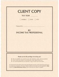Use this 9" x 12" cream tax return folder for a classic presentation to your client. It features a summary of information and safe storage instructions on the front. The 80# folder has two inside pockets with a die cut to display your business card.