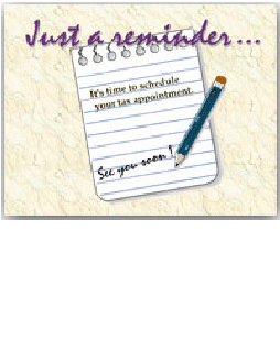 Use these Just a Reminder postcards to prompt your clients to schedule a tax appointment. These unique 8 1/2" x 11" perferated sheets allow you to add names and addresses to four cards at a time with your own laser printer, then separate them easily. This style is available in quantities of 100 cards. Back Message: Please call soon to set up an appointment. We look forward to serving your tax needs again this year.