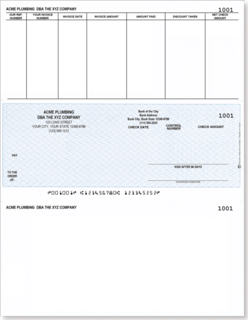 Order this laser Accounts Payable check and we'll print your company and bank information. You print variable data with your accounting software for a complete check. We can also print your logo and can custom design checks for your needs, please call us for details. Prices include standard imprinting. Each 8 1/2" x 11" sheets contains 1 middle check and 2 stubs and is constructed of 24# paper. Measuring from the top down the 1st stub is 3.5" high. The check portions begins at 3.5" and is 3.5" high. The 2nd stub begins at 7" and measures 4" in height.