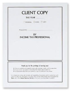 Use this white tax return cover for a classic presentation to your client. It features a summary of information plus safe storage instructions on the front. Add a touch of class with a custom imprint of your name and address. Compatible mailing envelopes can provide added security for mailing. This cover is available on smooth 80lb cover stock and measures 8 3/4" x 11 1/2" when folded.