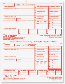 Use the W-2 Copy A to print employer wage and withholding information to send to the Social Security Administration.  This form is pre-printed with red scannable ink.  Forms are 2-up on an 8 ½” x 11” sheet with no side perforation and printed on 20# laser paper.   Order by the number of forms needed, not the sheet. Mail in a batch to the SSA.