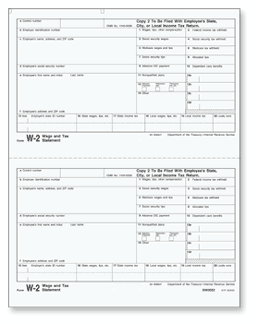 Use the W-2 Copy 2 to print wage and withholding information for employee submission with state or city tax return. This form is pre-printed with black ink. Forms are 2-up on an 8 ½” x 11” sheet with no side perforation and printed on 20# laser paper. Order by the number of forms needed, not the sheet.