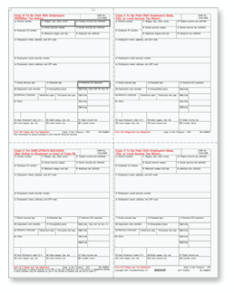 Use the condensed W-2 4-up to print and mail employee W-2 Copies B/C/2/2 (federal/file/state/city). Order 1 sheet per employee. Print all employee copies on the same sheet, fold and mail. Eliminate separating and collating forms! Forms are 4-up on an 8 ½” x 11” sheet with 2 perforations, creating a form in each quadrant. Pre-printed on 20# laser paper in black ink.