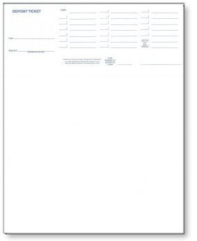 Blank laser deposit slips. THIS ITEM IS NOT PREPRINTED, if you need your company and bank information preprinted please see our item number 81089114. Each 8 1/2" x 11" sheet contains one laser deposit ticket. Use this blank deposit ticket with your accounting software, laser printer and MICR toner to produce complete deposit tickets. If you are using Quick Books order item number 81089114.